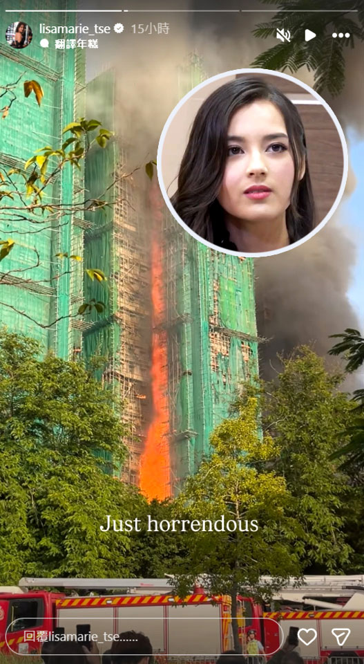 谢嘉怡先是在限时动态分享火场正面拍摄的画面,只见浓烟窜天、绿色棚架外火舌不断往上窜下:“Just horrendous(实在太可怕了)”。大火从建筑外墙竹棚一路延烧,画面震撼。随后,她贴出深夜时分的火场照片,整片住宅群仍在燃烧,火光映照夜空,心痛写道:“我向所有罹难者、受伤者与今天失去家园的人致上最深切的慰问与祈祷。今天我亲眼看着祖母的家在烈焰中烧毁,真是令人心碎的一天。”
