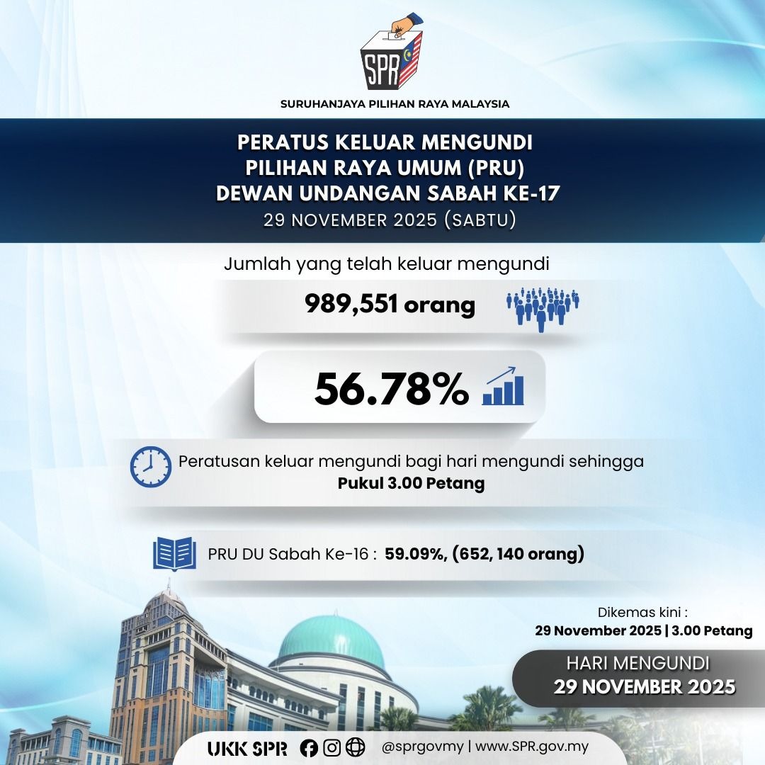 沙巴第17届沙巴州选举周六(11月29日)迎来投票日关键时刻,截至下午3时,投票率达56.78%,共98万9551名选民完成投票。