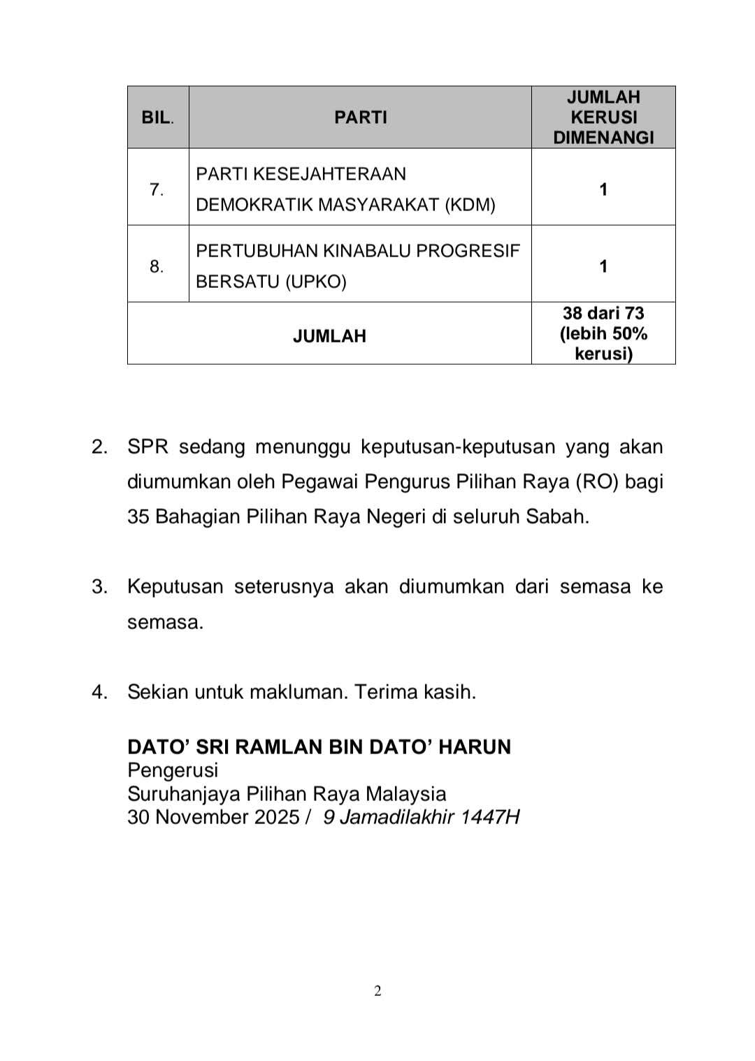此前,非官方成绩显示,公正党赢得新都敏(Sindumin)和文那纳(Melalap),赢得两个议席。