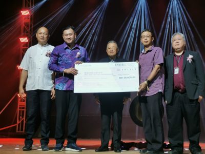 掌管吉打州华人事务的黄佳祯行政议员,在会上移交2万令吉模拟支票给新民独中作为教育基金。
