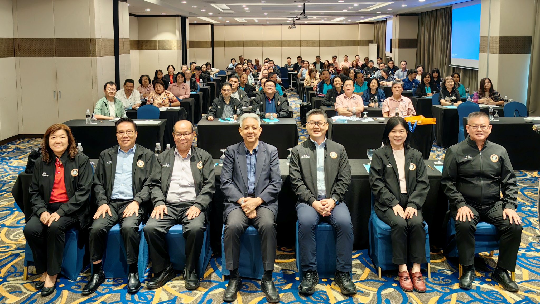 前排左起:教总副主席方良妹、副主席黄绍轩、副主席蔡明永、教总主席谢立意、副主席夏正恒、秘书长杜淑菁,以及财政王金忠在会上,与参与联席会议的各属会代表合影。