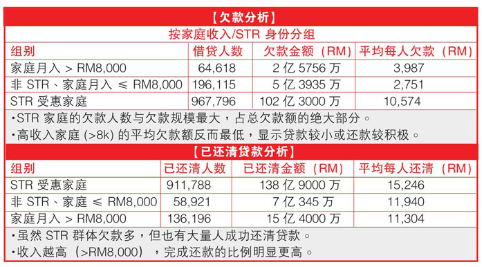 “至于来自STR受惠家庭的96万7796名借贷者,录得102亿3000万令吉欠款。”
