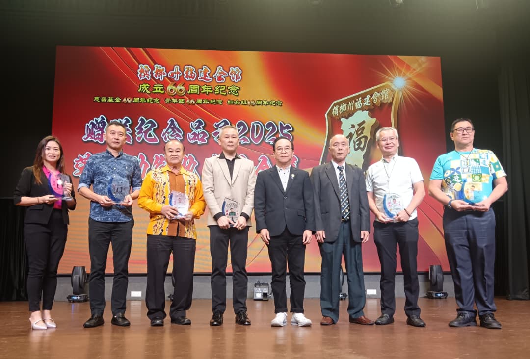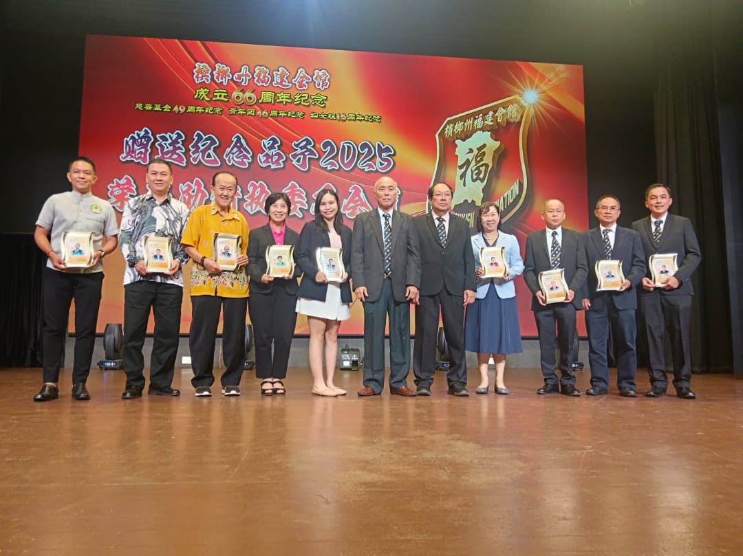 大会赠送纪念品给受封人士。左起张陈詠隆(代表)、王健贤、曾文忠、杜文远、陈坤海、陈来福、王笙侪、林子辉(代表)。