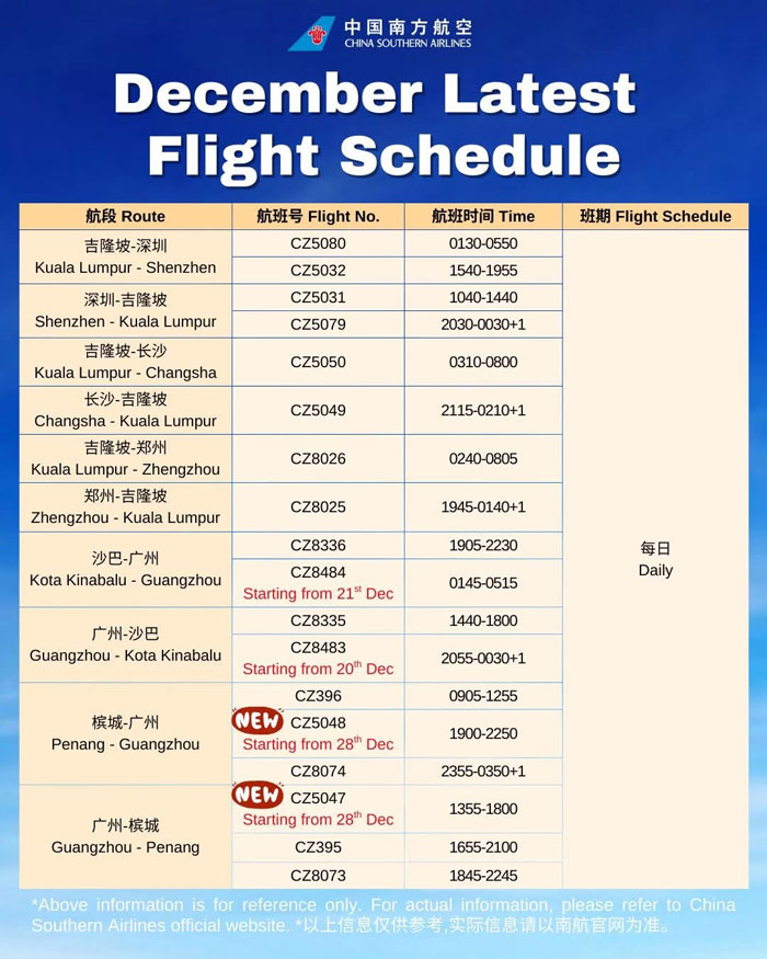 自2025年12月28日起,南方航空将调高中国广州直飞槟城的航班频次,由现有的每日2班增至每日3班。南航也是中国第一个航空公司每天有3个班机直飞槟城。