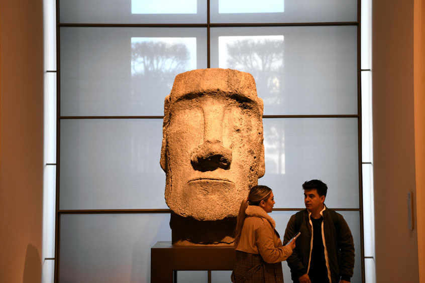 “五洲艺廊”入口处的显眼位置摆放着来自太平洋岛屿复活节岛的著名展品—摩艾石像。据卢浮宫介绍,摩艾石像代表的可能是复活节岛上民众神化的祖先。岛上居民把石像竖立在圣地上,以求得到神明的保护。