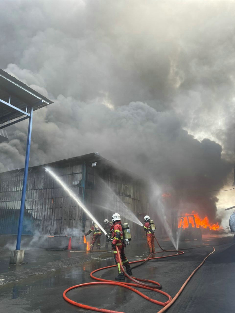 霹雳一家资源回收厂周五(5日)发生大火,起火点位于存放炼油原料的仓库,消拯队赶到现场时,火势已烧毁近40%面积且在蔓延迅速中,16名来自3个消拯局的队员正在努力灭火中。