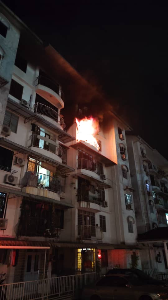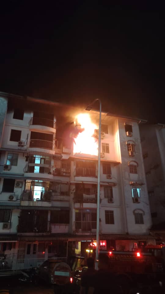 槟岛发林丹绒阁一座公寓5楼一单位突然失火,消拯员及时到场将一名怀孕已3个月的孕妇及另一人救出!