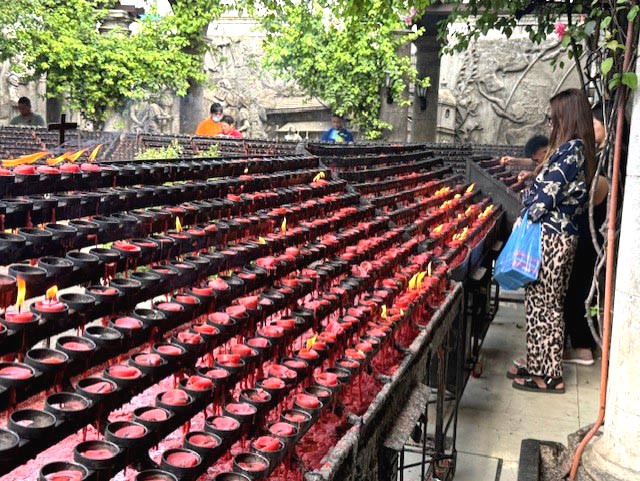 教堂内允许拍照,唯独一个房间里透明玻璃内安放着幼年耶稣的木雕像,相传是1521年麦哲伦送给宿务女王,教堂内氛围神圣庄严,装潢设计处处是历史的痕迹,还有信徒坐在长椅上祷告。历经多次战乱轰炸,唯独圣婴丝毫无损,因此当地人称为神迹显灵,每天都会有络绎不绝的信徒来到圣婴前祈祷祈福。教堂外,在外头有一整排烛台,供民众许完愿点蜡烛摆上去。