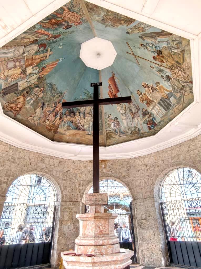 地点就在圣婴大教堂旁,这座十字架是1521年葡萄牙航海家麦哲伦抵达宿务时所竖,目前被保护在一座小型礼亭内亭内彩绘壁画细诉着葡萄牙航海家抵达宿务的历史场景。由于之前发生地震影响了建筑物的架构,目前人们被禁止入内,只能在栏杆外欣赏。十字架下方的台柱堆满了一根根五颜六色细长的蜡烛,蜡烛是信徒的祈福,不同颜色的蜡烛各具意义,周围可见身穿黄衣红裙的阿姨在旁叫卖蜡烛,帮人们祈福。