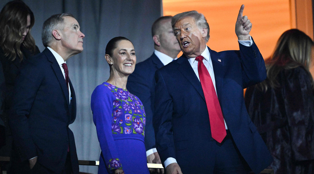 美国总统特朗普与墨西哥总统辛鲍姆和加拿大总理卡尼一起出席抽签仪式。