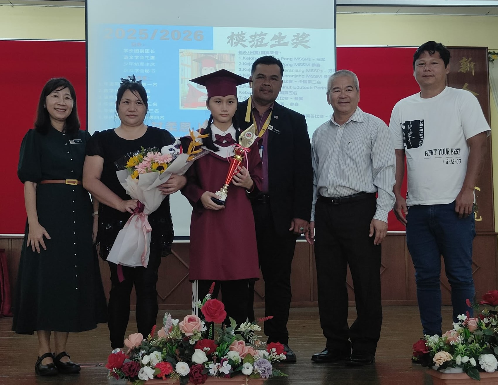 甘柔恩荣获新邦华小今年的模范生奖,以表彰她在学业、品格及校园活动中的出色表现。出席嘉宾包括教育局官员扎迪里、董家协成员及六年级班级主任黄迎紫。