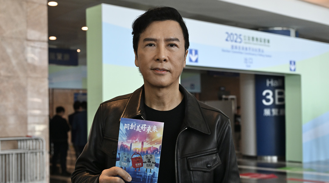 港政为感谢市民投票,特印制“心意谢卡”送给投票后的市民。图为全国政协委员、香港著名演员甄子丹投票后手持谢卡合影。(图:中新社)