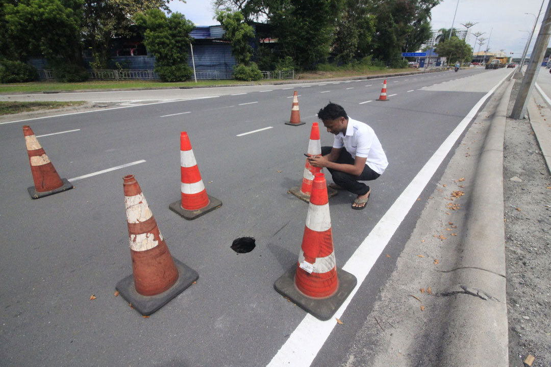 北海外环公路衔接王俊畅路(Jalan Heng Choon Thian),即靠近槟城港口有限公司一带的路段,才在今年9月完成沥青铺设,然而周一(12月8日)上午却被民众发现路面出现一个足以容纳整只手掌的大坑洞,预计维修工程将在晚间展开。