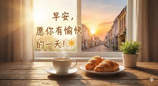🗣️ 简单版: “请帮我生成一张温馨的早安图,加上一句祝福:早安,愿你有愉快的一天。”
