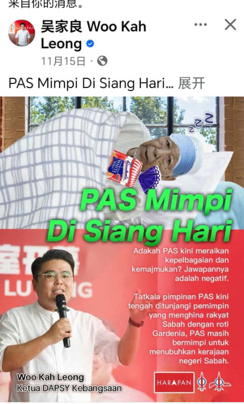“我非常好奇的是,当巫青团长阿克马沙烈包围五金店时,为何伊党与伊青团不举报他?如今却为一张只有伊党领袖和某牌子面包的图片报警。更讽刺的是,国盟领袖曾在吉打州议会用同样的面包羞辱沙巴选民。”