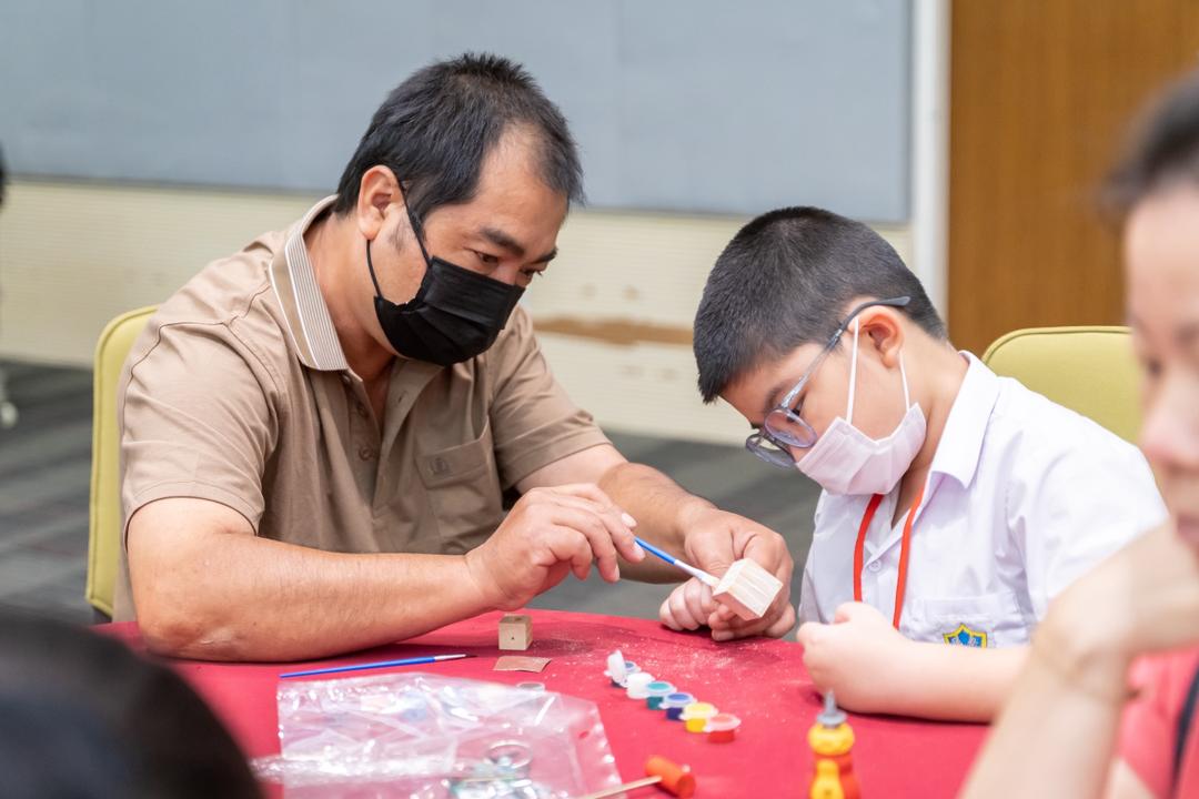 活动以五行元素“玩一日,学一艺”主题进行了亲子互动工作坊,包括机器人木工手艺、锡纸画画、基础急救培训等。