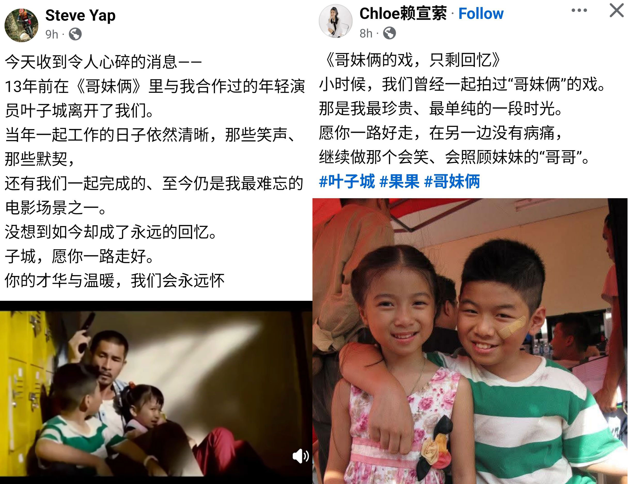 噩耗传出后震惊本地影视圈,不少曾与他合作的导演与演员纷纷发文悼念,难掩悲痛之情。徐有利得知噩耗后,难掩悲痛,在社交平台发文写道:“天…电影中的果走了,一时真的接受不到。”他透露叶子诚因病离世,走得突然,并晒出两人最后一次的讯息往来,“那是你发来的祝福,当时叔叔正进行心脏手术。”他感叹缘分短暂,“如今你才25岁……天妒英才,实在惋惜,你永远是叔叔心中的真人版果果。”