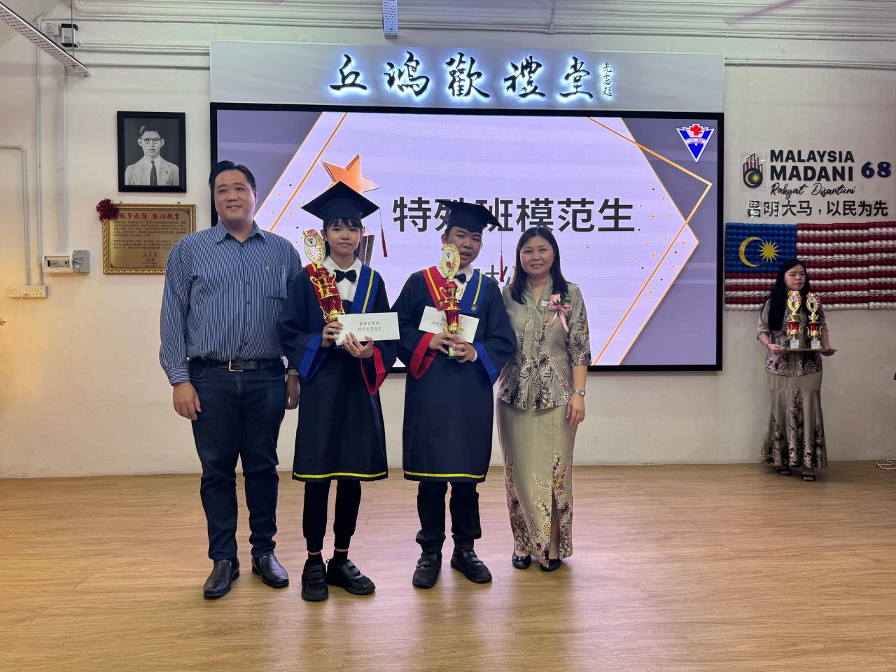 全体毕业生在领取毕业证书后,与出席的嘉宾合影留念。会上致辞者,尚包括家协主席黄义胜及校友会副会长陈月好。毕业生也移交毕业献金给予1350令吉,并由该校家教协会代表接领。