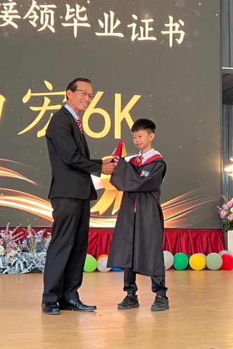 毕业生也共同筹得6066令吉毕业献金回馈学校,由毕业生邱亮炽及邓恺萱代表移交,象征薪火传承,由校长黄荔纺接领,学校三机构同人见证。