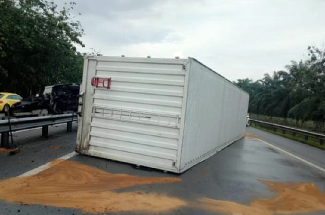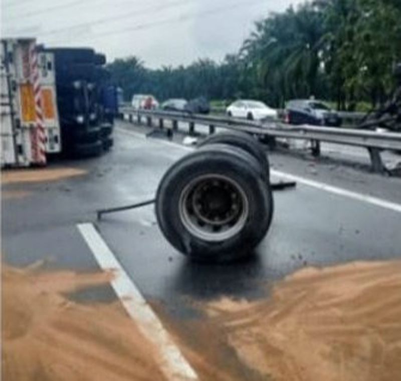 此车祸周四(12月11日)下午约4时45分,发生在南北大道南下210公里,靠近章吉遮令路段,事发后,大道分界堤被撞毁,罗里的货柜及车头分别横搁在大道中央,车轮也脱落,当局过后开辟紧急道路疏通来往交通。