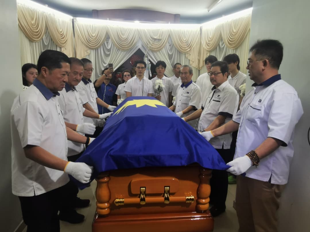 马华吉州领袖蔡通易、陈燕翔、伍顺立局绅、拿督黄荣贤、谢有福及许汉宏以马华党旗覆棺后扶棺缓缓步出门槛。