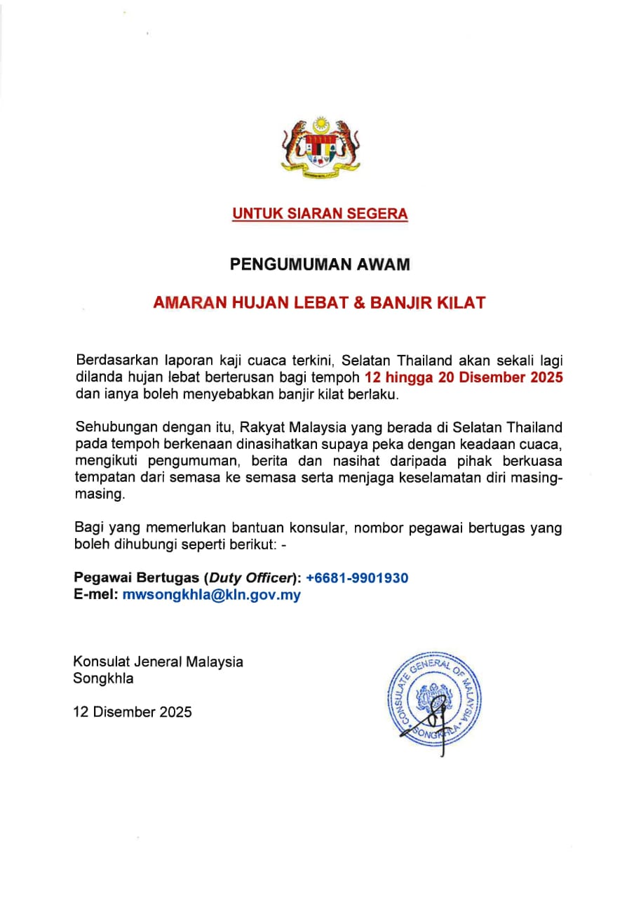 大马驻宋卡总领馆发出警报,在12月12日至20日之间,泰国南部将持续暴雨天气,可能会引发水灾,促请大马公民注意。