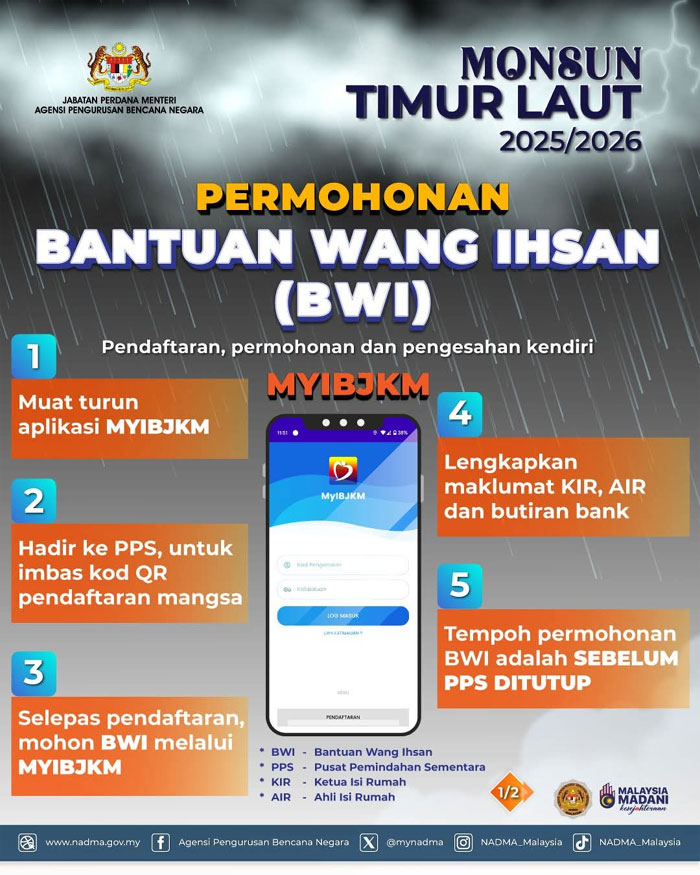 国家天灾管理机构(NADMA)提醒全国的水灾灾民,务必在临时疏散中心完成登记,并在社会福利部 MyIBJKM 手机应用程式填写完整资料,以确保天灾援助金能够在灾后快速、准确及有序地发放。