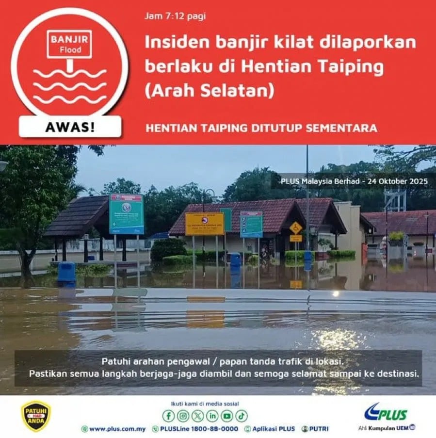 受周四连绵大雨影响,南北大道太平休息站因淹水已经暂时关闭,直至另行通知。