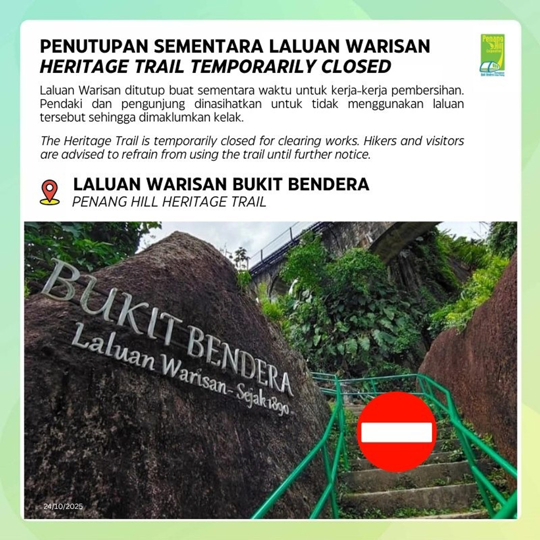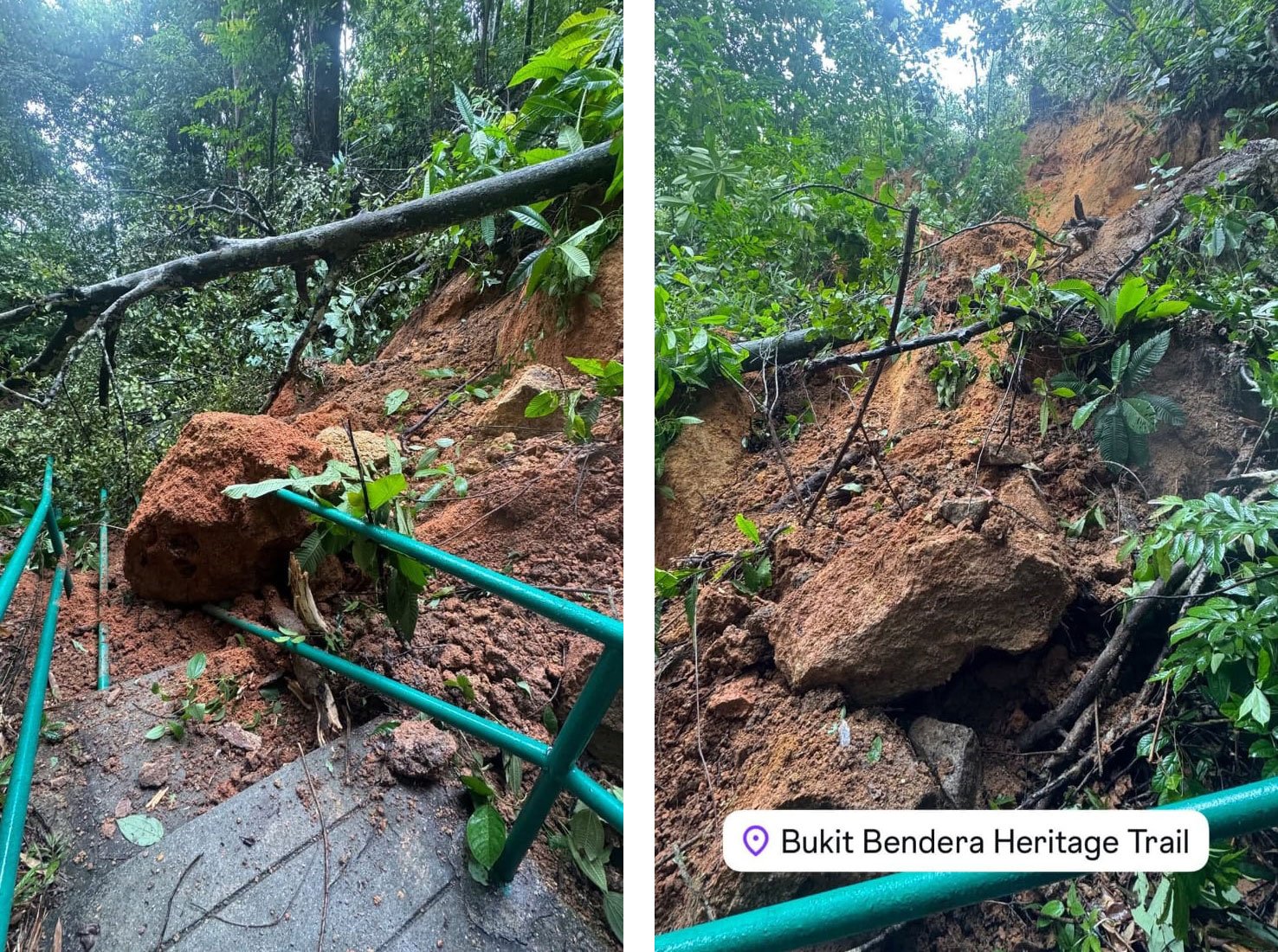连日大风大雨导致升旗山古迹山径(Heritage Trail)发生小土崩,目前已暂时关闭。升旗山机构总经理拿督石礼兴指出,虽然情况并不严重,但为安全起见,他呼吁公众暂时停止登山活动,待天气稳定与山径维修完成后再前往。