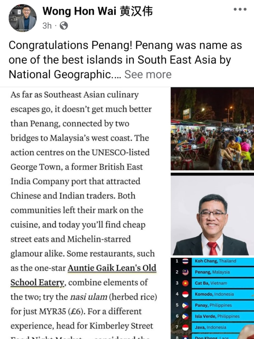 黄汉伟在脸书发帖宣布,槟城被《国家地理》杂志评选为东南亚最佳岛屿第二名,而最佳特色为美食!
