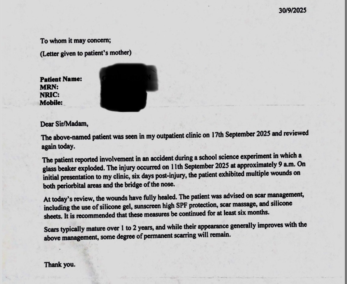 一名母亲控诉在私人学校就读的女儿,2个月前在上科学课时发生实验爆炸事故,女儿受伤甚至留下永久性疤痕,校方迄今无法给家长一个满意的交代!