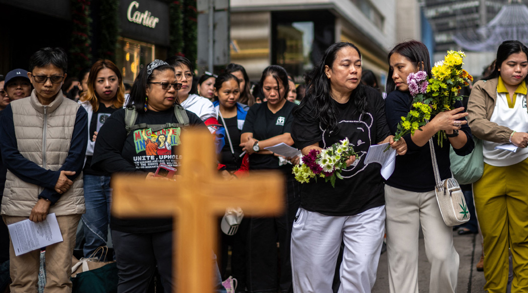 香港有近37万名外籍家庭佣工,她们大多来自菲律宾和印尼,在人口老龄化的香港照顾婴幼儿和老人。图为居港菲籍人士周末参与悼念仪式。