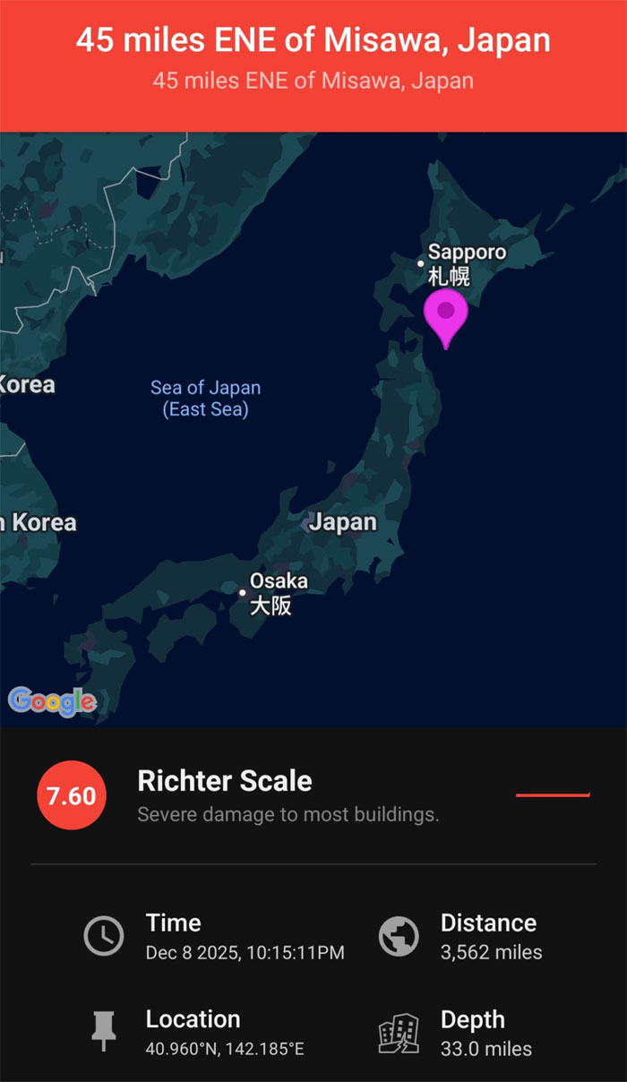 根据日本共同社报道,地震最初测得震级为7.2级,震源位于青森县附近海域,深度约50公里。随后,当局将震级上修至7.6级。地震在青森县的震感强度达日本地震烈度等级 6+,属于剧烈摇晃,足以让人无法站立。