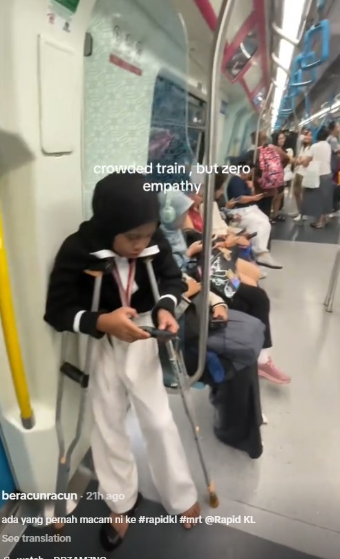 社交媒体近日流传一段短视频,画面显示一名双臂拄着拐杖的年轻女孩在捷运(MRT)女性专用车厢内站立,但车厢内多名女性乘客疑似未察觉她的状况,因此无人让座。