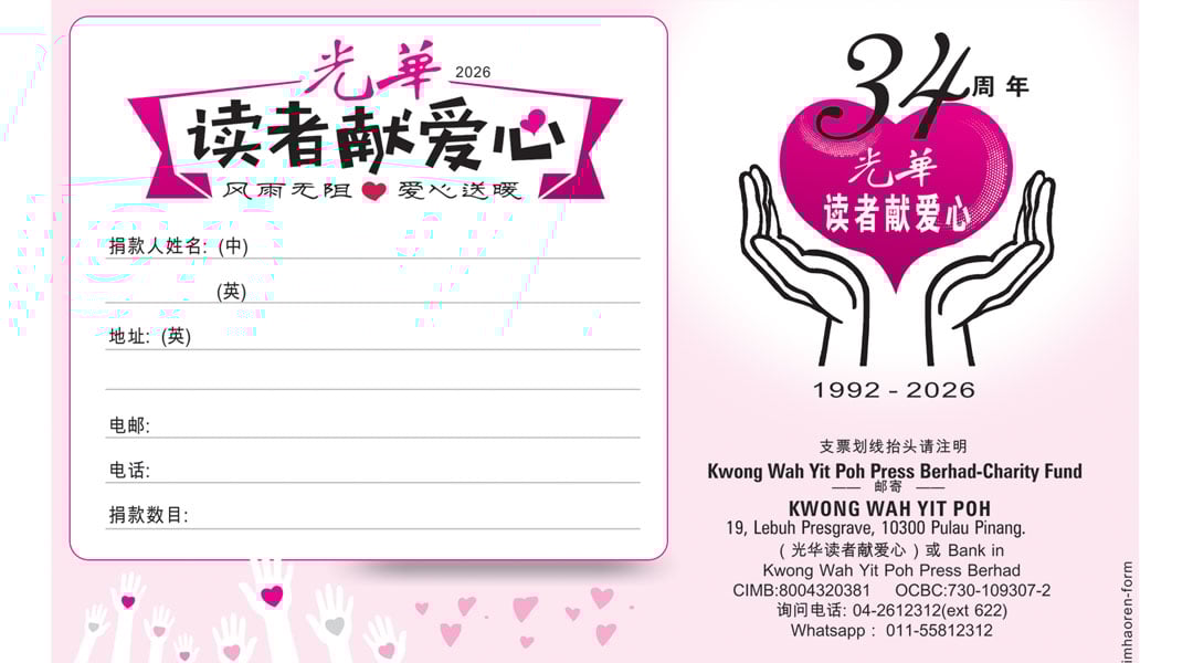 一年一度的《光华日报》“读者献爱心”筹募善款活动即日起可接受来自四面八方的热心人士捐款,欢迎民众踊跃支持,达到助人为快乐之本精神。