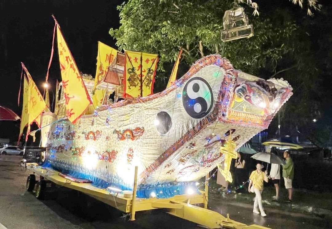 全马最大纸扎皇船出巡 善信民众撑伞沿路观看