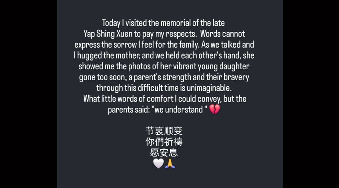 “男生刺死学姐案”死者叶芯嫙的母亲黄丽萍感谢各界,在她痛失爱女后不断给予关怀和慰问,并呼吁民众一起为女儿诵念佛经,希望能疗愈女儿的身心,引领她前往安宁之境。