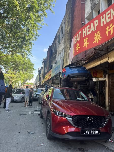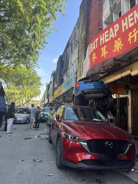 柔佛新山彩虹花园今早(16日)上演惊险一幕,一辆蓝色迷你库柏(Mini Cooper)轿车疑失控,“飞上”一辆红色轿车车顶,并卡在店铺招牌与轿车之间,引起大批好奇民众围观。