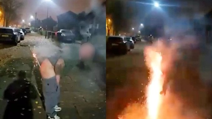 一群男子趁着烟火之夜玩鞭炮,其中一人竟将冲天炮夹在臀部间,友人点火后,众人原以为烟火会飞上天空,没想到却在臀部间直接爆炸,男子当场痛苦呻吟。