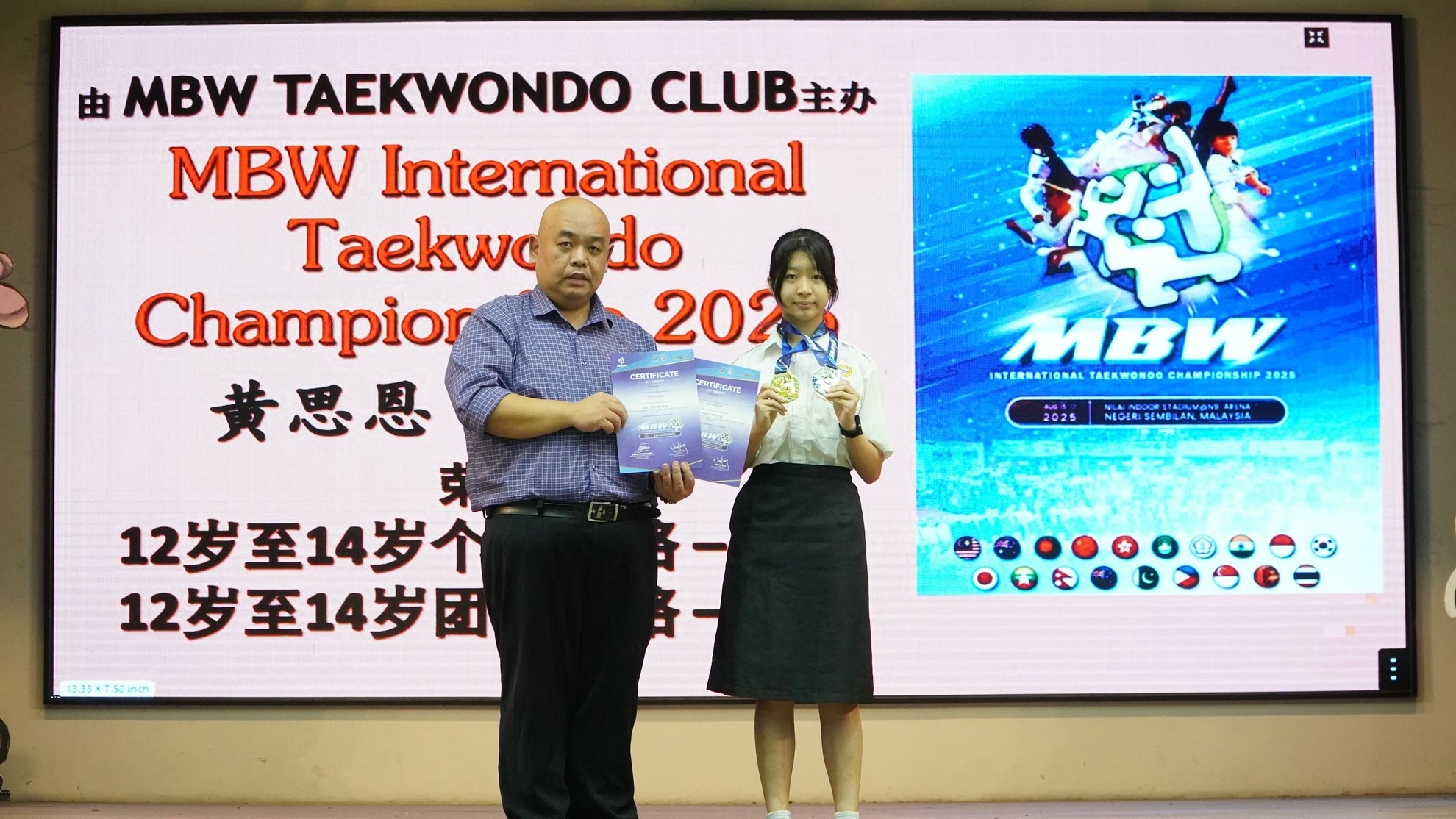 霹雳育才独中初二爱班黄思恩同学在国际跆拳道赛中表现出色,于MBW Taekwondo Club主办的“MBW International Taekwondo Championship 2025”中脱颖而出,分别夺得12岁至14岁个人套路金牌及12岁至14岁团体套路银牌,为校赢得荣誉。