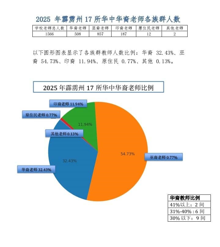 霹雳董联会指出,国民型华文中学(华中)的教师族群结构与学生的实际需求出现明显落差。根据该会最新调查,霹雳州今年华裔教师比例已从2024年的34.30%,下降至32.43%;相对地,巫裔教师比例则从52.22%上升至54.73%,其余教师分别为印裔11.94%、原住民0.77%,以及其他族群0.13%。