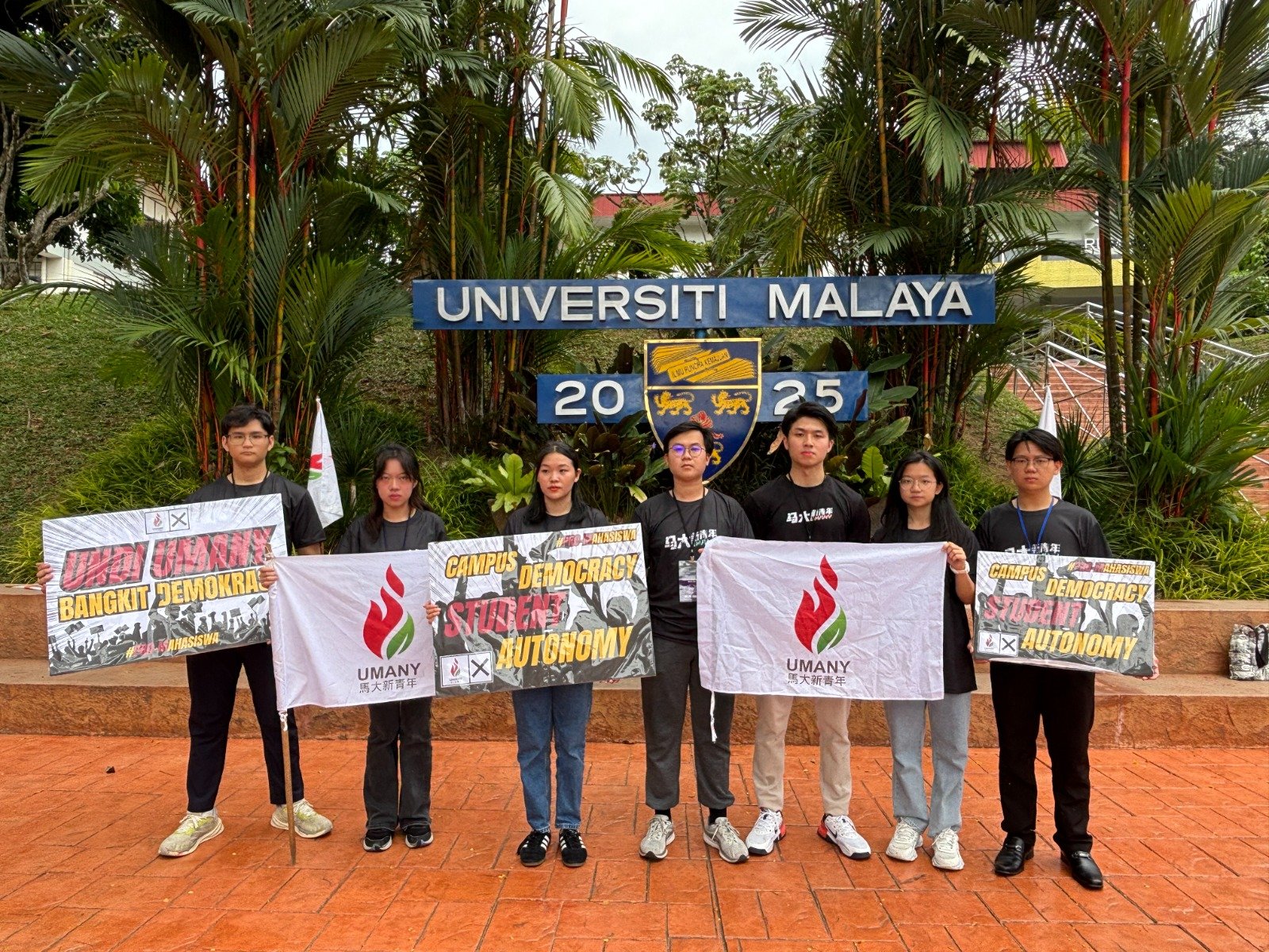 马大新青年(UMANY)联合多支学生阵营及马大校园选举委员会主席,周五在马大东姑大礼堂前召开记者会,公开揭露并强烈谴责校方公然干预校园选举的独立性,企图操弄选举结果。