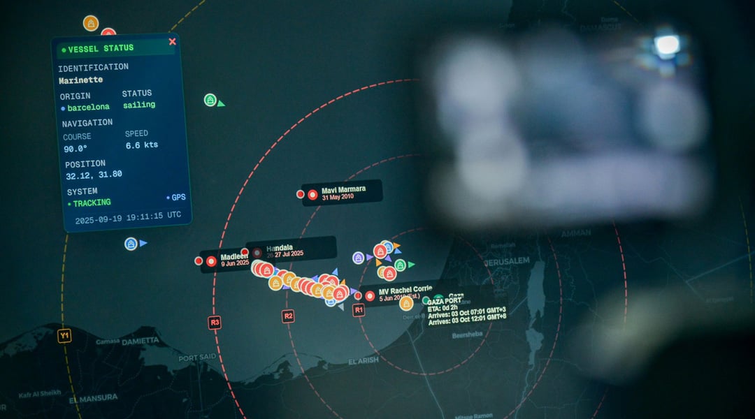 “全球坚韧船队”(Global Sumud Flotilla,简称GSF)最后一艘驶往加沙运送人道援助物资的船只“Marinette”……