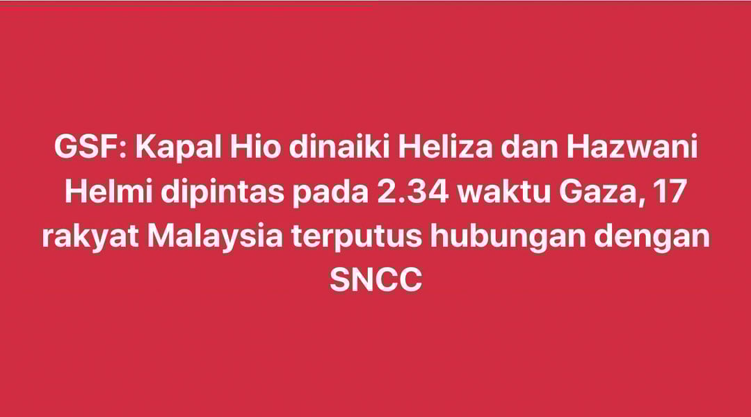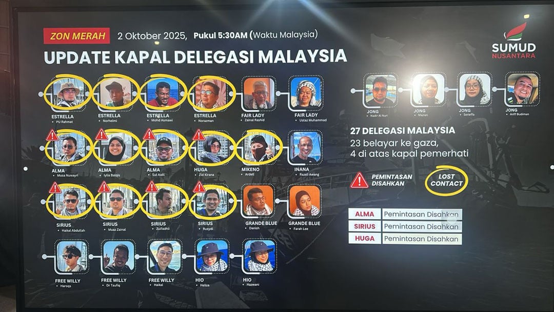 13名随同“全球坚韧船队”(Global Sumud Flotilla,简称GSF)人道任务出发的马来西亚志愿者,乘坐5艘船只前往加沙途中,于昨夜在加沙海域遭以色列军队拦截后,与“努山塔拉坚韧指挥中心”(SNCC)失去联络。